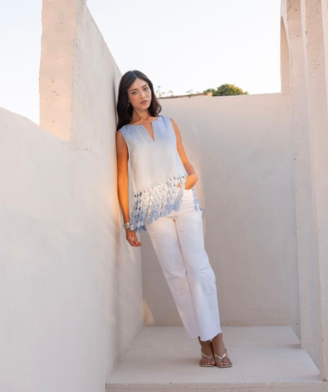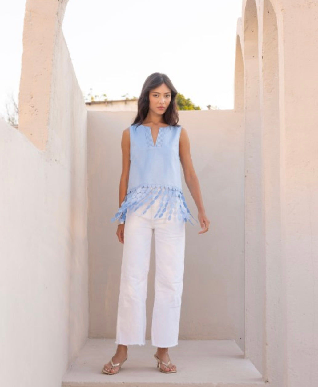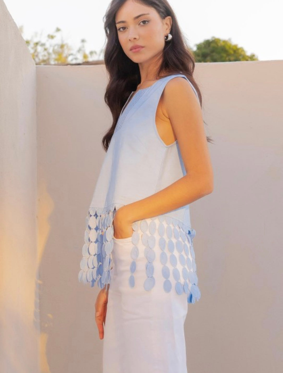 This baby blue tank brings a playful vibe with its flattering V-neckline and charming circle cutouts along the hemline. Perfect for adding a fun twist to your casual outfits while keeping things light and breezy.