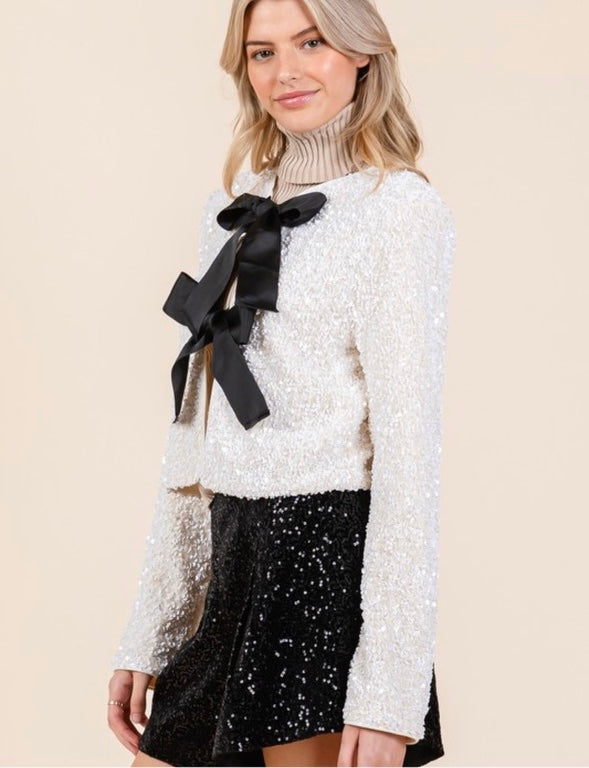 Add a touch of elegance and glamour to your holiday wardrobe with our beautiful cream sequined jacket. Featuring two black bows on the front center, this jacket is the perfect statement piece for any special occasion. Style it with your favorite skirt or dress pants to complete your luxurious look.